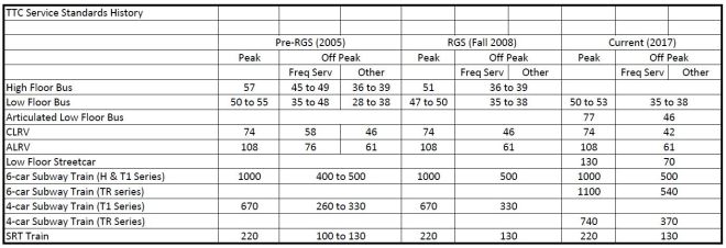 The RGS standards reduced the peak load on buses by about 10%, and eliminated the provision for standees during off-peak periods on both bus and streetcar routes. Riders might be forgiven for wondering whether that standard was ever actually achieved given the usual level of crowding on busy routes.