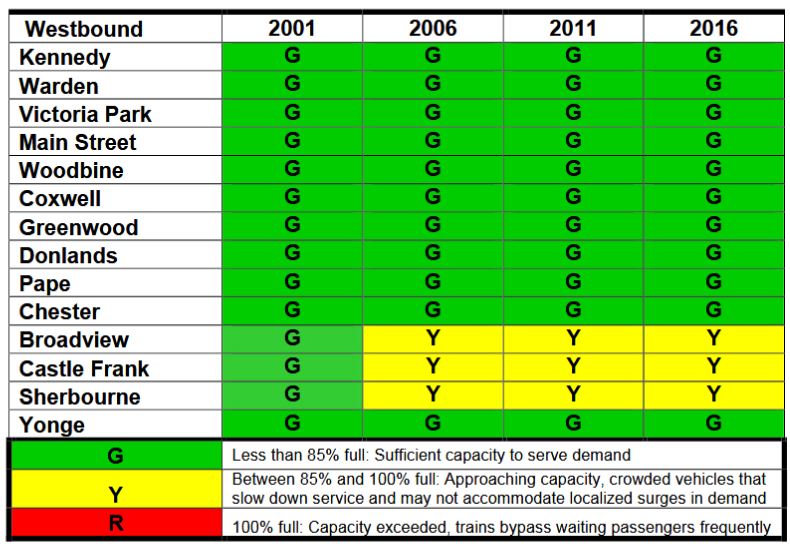 At this point, the subway would be almost full at 96% of theoretical capacity. However, the slightest error in any of the assumptions, not to mention the TTC’s inability to actually achieve its scheduled capacity, would put the route over the line.