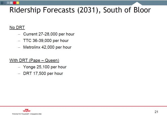 Back in December 2008, TTC staff gave a presentation on the recommended configuration of the Richmond Hill extension and the issues it raised. This presented a rather rosy picture of the ability to handle rising demand on Yonge without building the Relief Line, even though it recognized the huge benefit such a line would have in reducing demand on the heart of the subway system downtown.