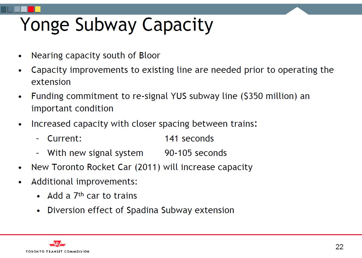 In the slide below, note the claim that the new signal system could provide a 90 second headway. This has been the source of much misinformation about subway capacity. ATC can run trains quite close together, but this is intended only in backlog situations or where there is a crunch point with long dwell times. It is not achievable over the entire route, especially at terminals. A sustained 90 second headway (40 trains/hour) translates to a capacity of 44,000/hour, the sort of number that can be thrown about to claim we would never need a relief line.
