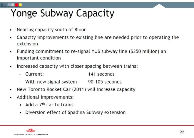 A further issue in planning for the YUS is the available fleet. Peak service now requires 61 trains in the AM and 63 in the PM. (Although the headways are wider in the PM, no trains short turn and so more are required to operate full service to Vaughan.) Moving to 30 trains/hour is an increase of about 18% taking the total fleet requirement to 74, not including spares or gap trains. However, the TTC only owns 76 TR trainsets, and cannot get to 30 trains/hour with the current fleet, let alone to 33. There are no plans in the capital budget for the additional trains required to improve service.