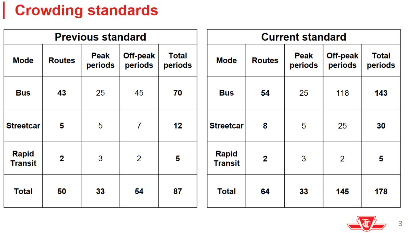 In the “current standard” section, this means that 64 routes have overcrowding relative to standards at some time during the week. There are 33 cases where a route is overcrowded during the peak period and 145 cases where a route is overcrowded during the off-peak. The information is not subdivided to show whether the problems exist mainly on weekday middays or on weekend evenings (for example). It is worth noting that the rapid transit system which only has 4 routes (and hence 8 peak periods) is overcrowded during 3 of them relative to standards, and also has 2 off-peak periods where crowding is a problem. Improved off-peak service on Line 1 Yonge-University was proposed by TTC staff, but this did not make the cut in the TTC’s budget discussions due to cost.