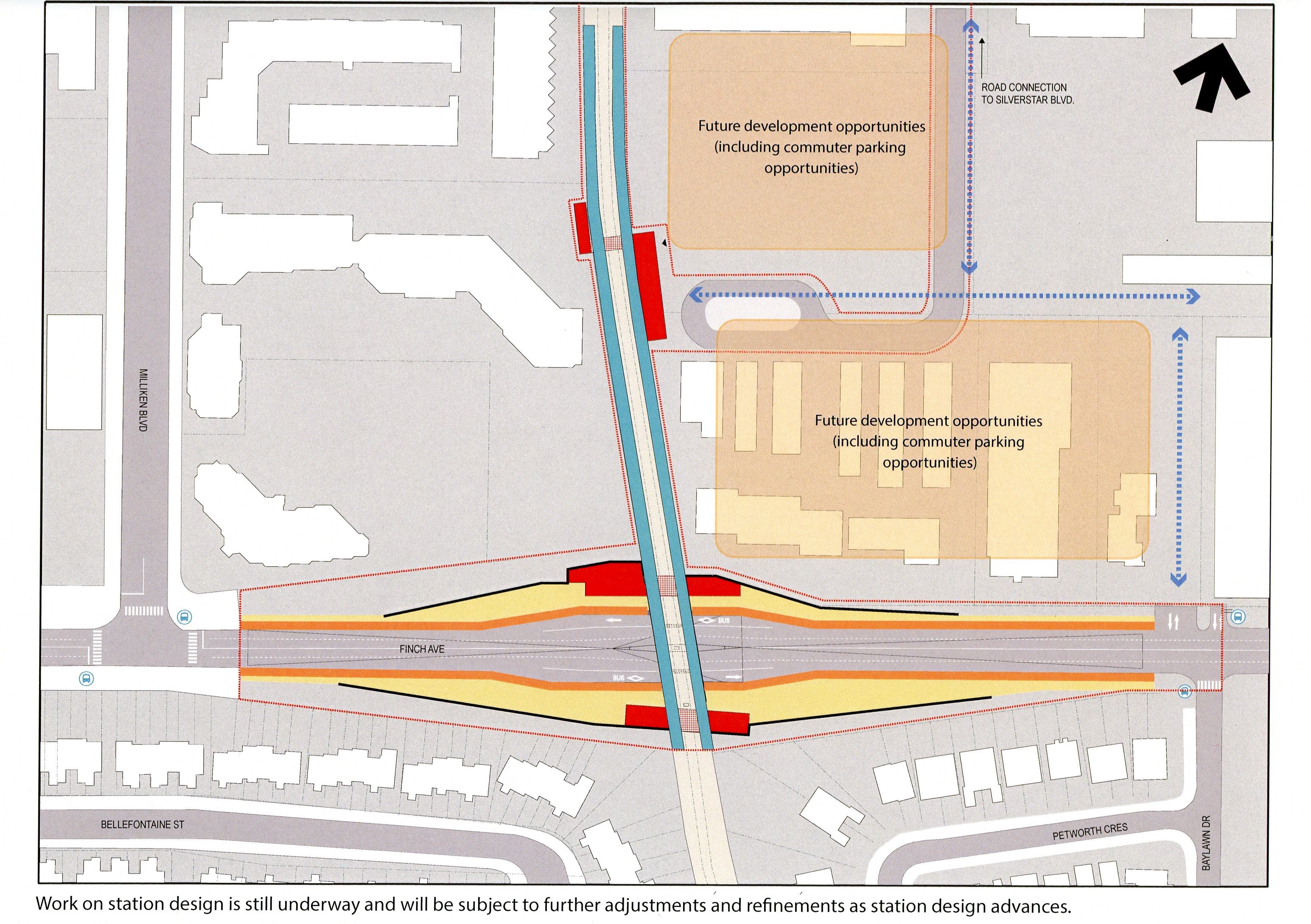 The Finch-Kennedy station is at a point on the corridor which is now a level crossing between Finch Avenue East and the railway. The proposed station would span a new underpass for Finch Avenue with connections to bus service in the underpass. The main station building would lie further north at a point where auto access would be provided for drop offs and pickups including Wheel-Trans service.