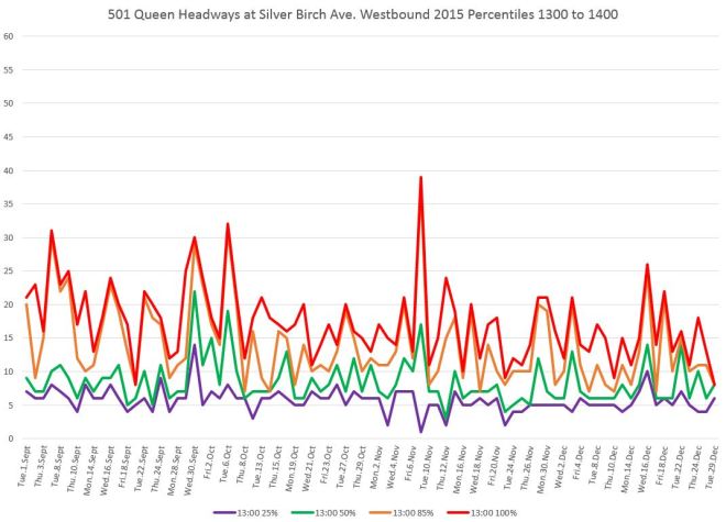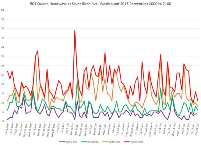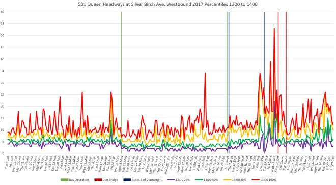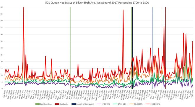 From Thanksgiving weekend until late November, streetcar service turned back at Woodbine Loop and a bus shuttle operated to Neville while track work was in progress there. This period is marked off by the green bars. With this isolated service, the span of headways is considerably smaller and the various percentiles are more clustered around the median value. Even then, the service is ragged on some days, particularly late in this period. A review of the daily service charts (not included here) reveals that on some days buses were missing for part of the day, and those that remained appear to be running on their schedules rather then being spaced out to give even headways.