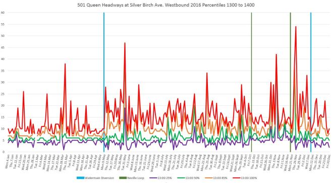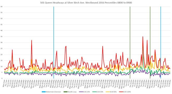During 2016, the headways at Neville were better behaved than in the Fall of 2015, even during the period of the diversion. The major change was that the streetcars serving Neville no longer operated through to Long Branch, except late in the evening. (Note that there is a small gap in the charts because I do not have February data.)
