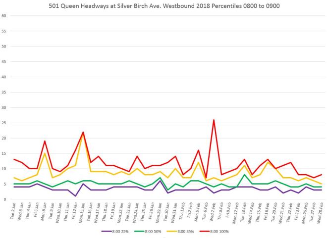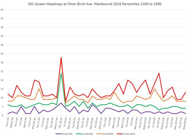 The TTC should have this kind of detailed analysis available as part of its program to measure and report on service quality, reports that have been missing, despite being part of the “Customer Charter”, for three years. Too many performance metrics, to the extent they even exist at the TTC, are summarized a high level masking the real extent of poor service. Queen is supposed to be part of the “Ten Minute Network”, but one would never believe it from actual operating results.