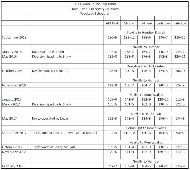 By the beginning of 2017, the scheduled trip time from Neville to Roncesvalles was close to or greater than the time allowed for trips to Humber at the end of 2015. The times were further increased in the March schedules for a construction diversion that did not actually occur. This is reflected in the less erratic service at Neville in early 2017.