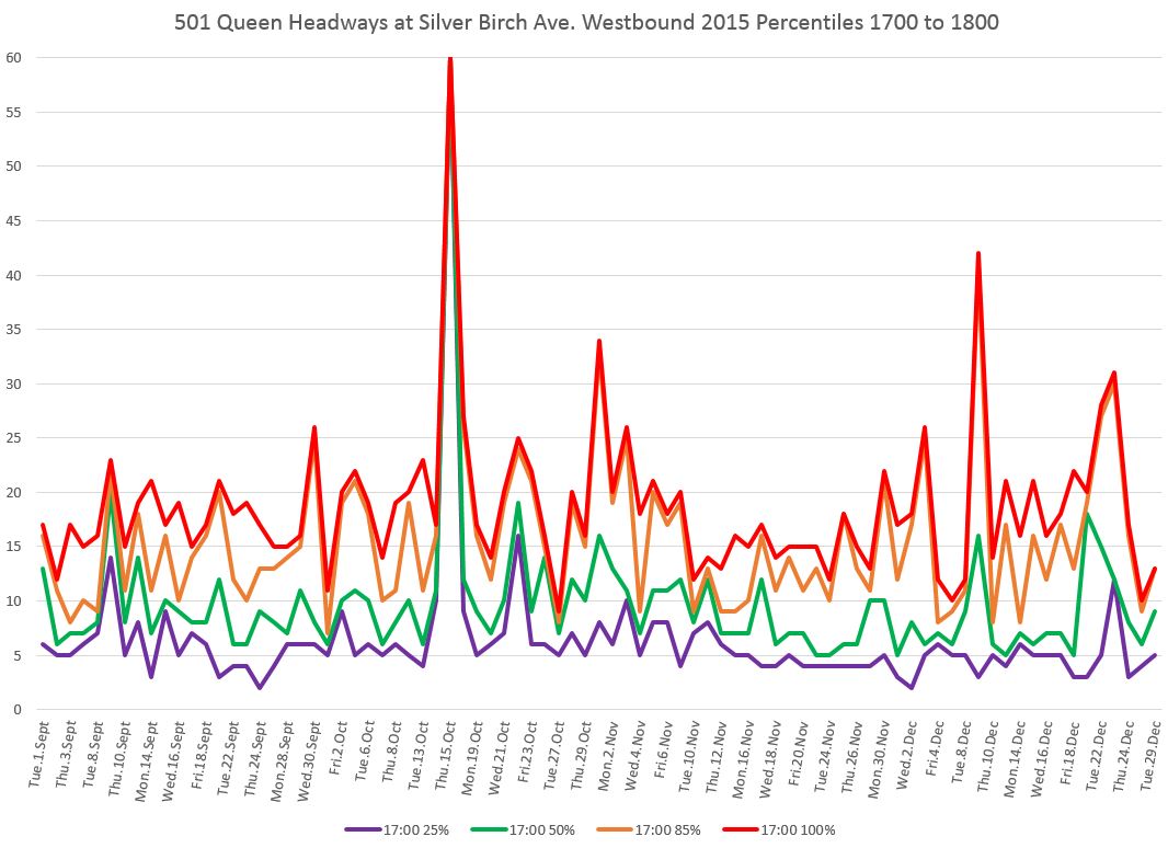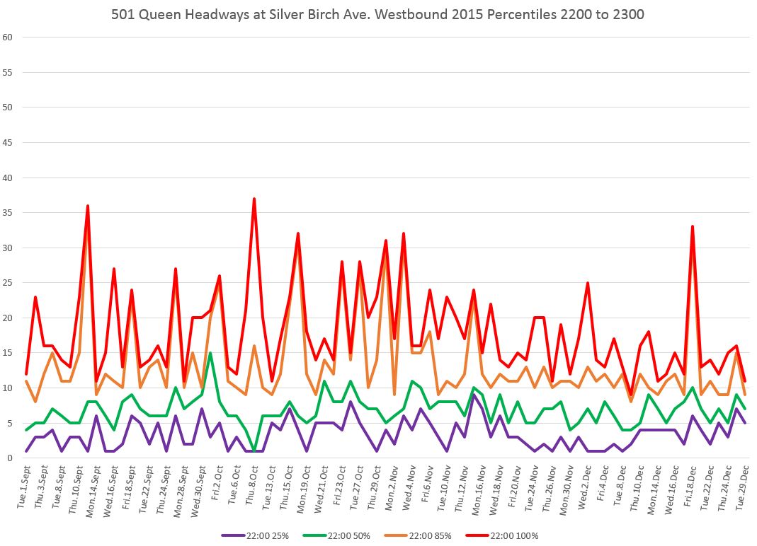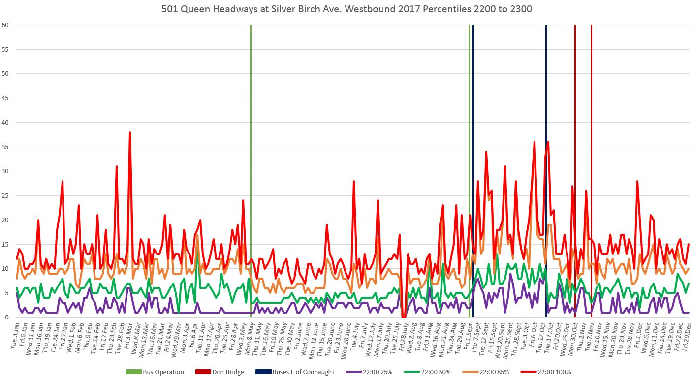 From Thanksgiving weekend until late November, streetcar service turned back at Woodbine Loop and a bus shuttle operated to Neville while track work was in progress there. This period is marked off by the green bars. With this isolated service, the span of headways is considerably smaller and the various percentiles are more clustered around the median value. Even then, the service is ragged on some days, particularly late in this period. A review of the daily service charts (not included here) reveals that on some days buses were missing for part of the day, and those that remained appear to be running on their schedules rather then being spaced out to give even headways.