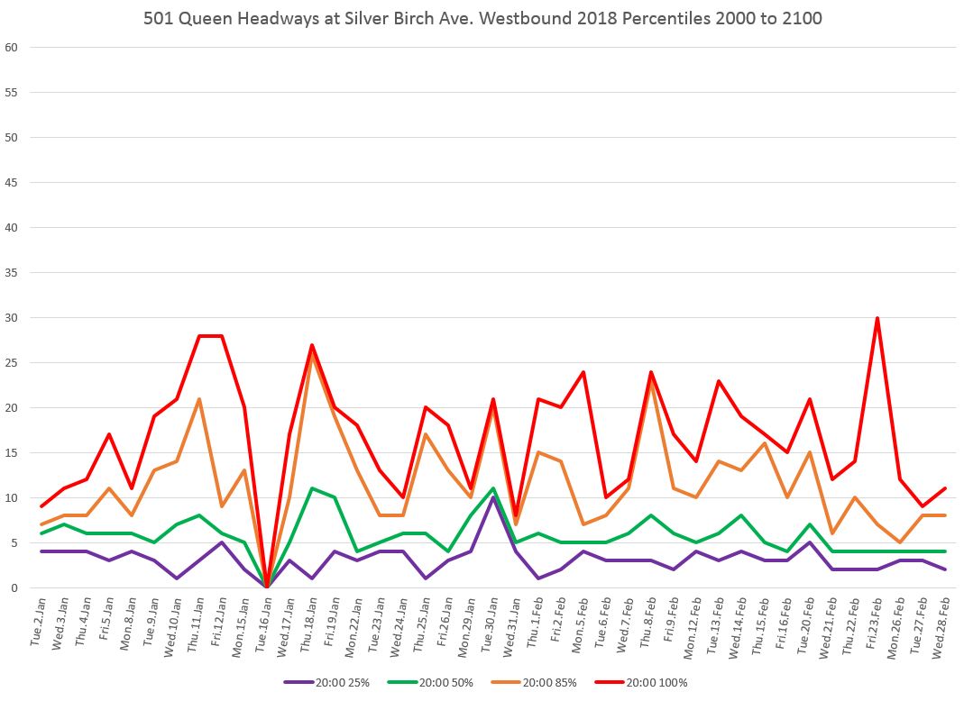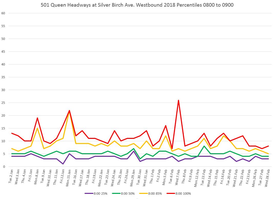 The TTC should have this kind of detailed analysis available as part of its program to measure and report on service quality, reports that have been missing, despite being part of the “Customer Charter”, for three years. Too many performance metrics, to the extent they even exist at the TTC, are summarized a high level masking the real extent of poor service. Queen is supposed to be part of the “Ten Minute Network”, but one would never believe it from actual operating results.