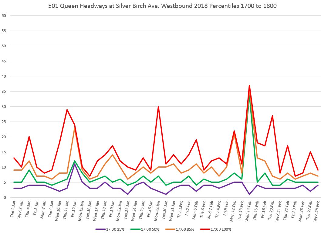 Schedules for the Queen car were changed in mid-February in anticipation of the line re-opening to Humber Loop, but service only operated to Roncesvalles. This added recovery time to the operation, and that should be reflected a reduction of short turns and greater flexibility in managing service. Although there is some indication of this in the data, the addition of March data, when available, will confirm this.