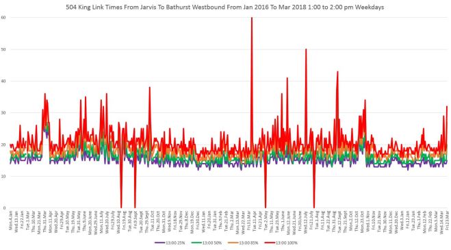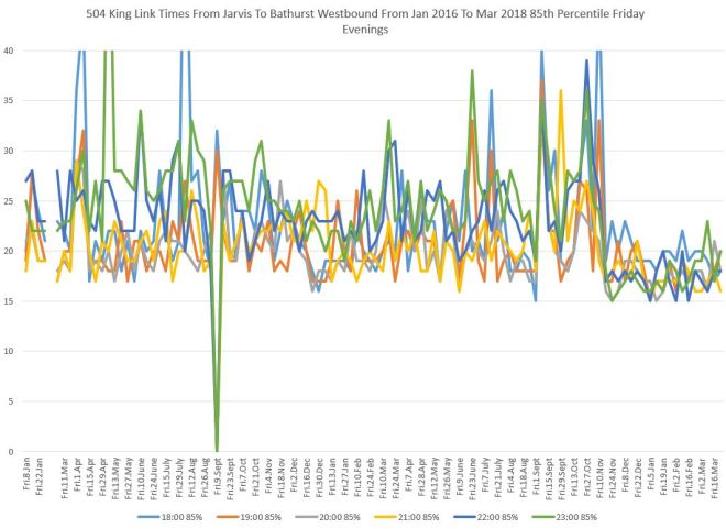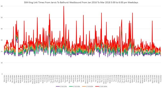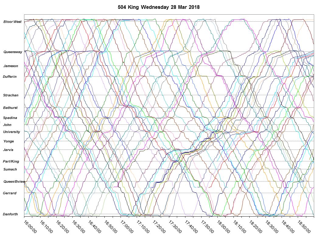 A similar problem with bunched service triggering queueing delays is visible at Bathurst eastbound at about 5:00 pm.