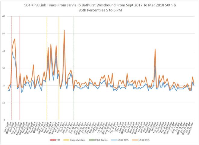 Severe congestion is evident approaching University Avenue and also at Spadina Avenue in the latter part of the hour from 5-6 pm (17:00 to 18:00). The problem begins with a backlog of cars approaching Jarvis, and once these move off through the pilot area, they encounter delays at traffic signals because it is common for only one car to clear the intersection on a cycle while the car ahead serves the farside stop. (This was also a problem for nearside stops before the pilot because of the TTC practice that a car must be at the stop before operators open the doors. Combined with traffic signal delays, this can throttle the rate at which bunched cars can clear an intersection.)