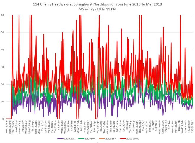 Note that the charts for 514 Cherry have a different maximum Y-value of 60 minutes compared to 30 minutes used for 504 King. This was necessary to display the very common high values found in the Cherry route’s headway data.