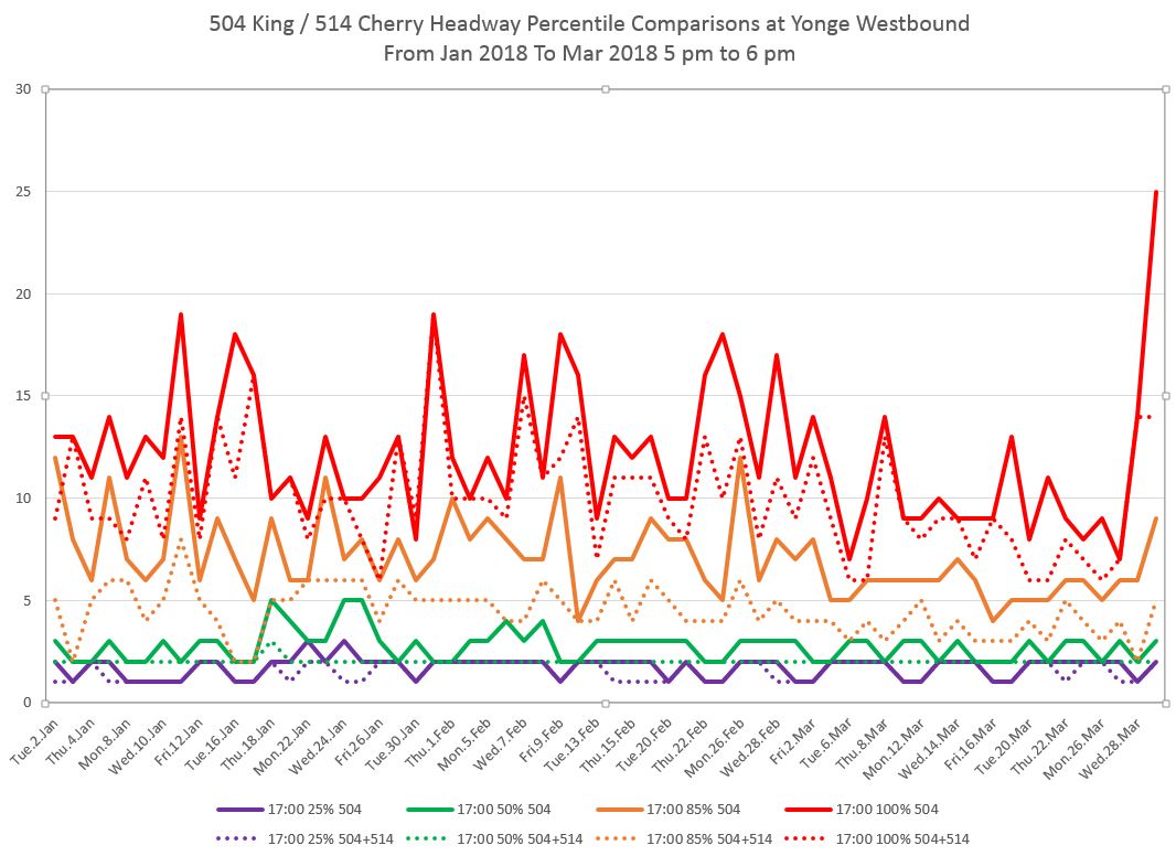 The solid lines are the 504 King data, the same as are charted in the previous section, but over a longer interval. The dotted lines show the effect of the additional 514 Cherry service which pulls down the 85th percentile, and also makes some dents in the 100th percentile peaks.