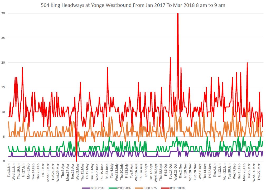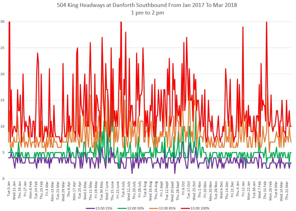 If the 25%, 50% and 85% values are all similar, this indicates that the lion’s share of the service is running in a narrow band of headways, and that brings reliability from a rider’s point of view.