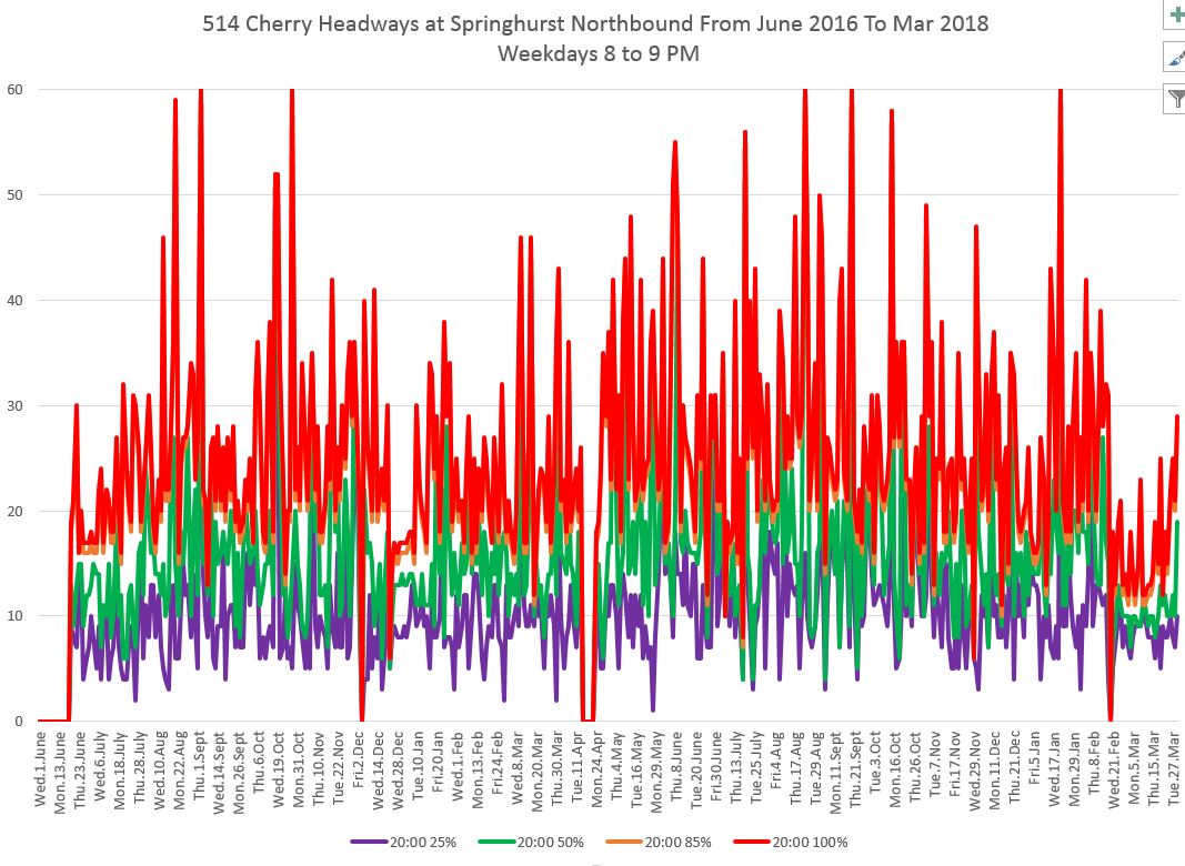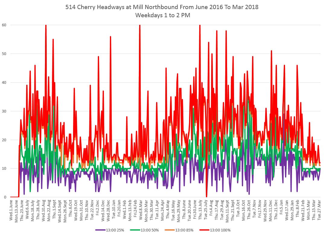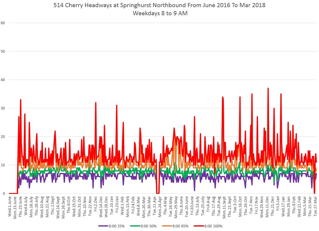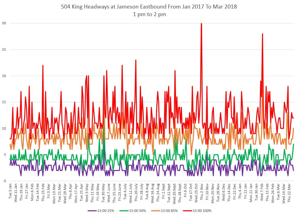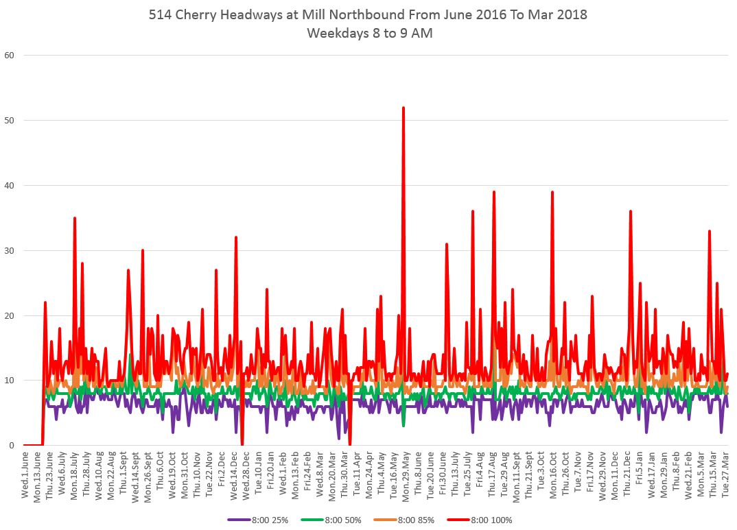 Note that the charts for 514 Cherry have a different maximum Y-value of 60 minutes compared to 30 minutes used for 504 King. This was necessary to display the very common high values found in the Cherry route’s headway data.