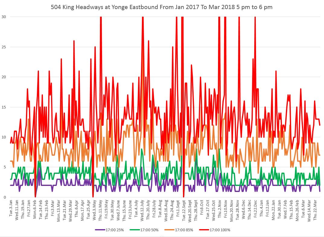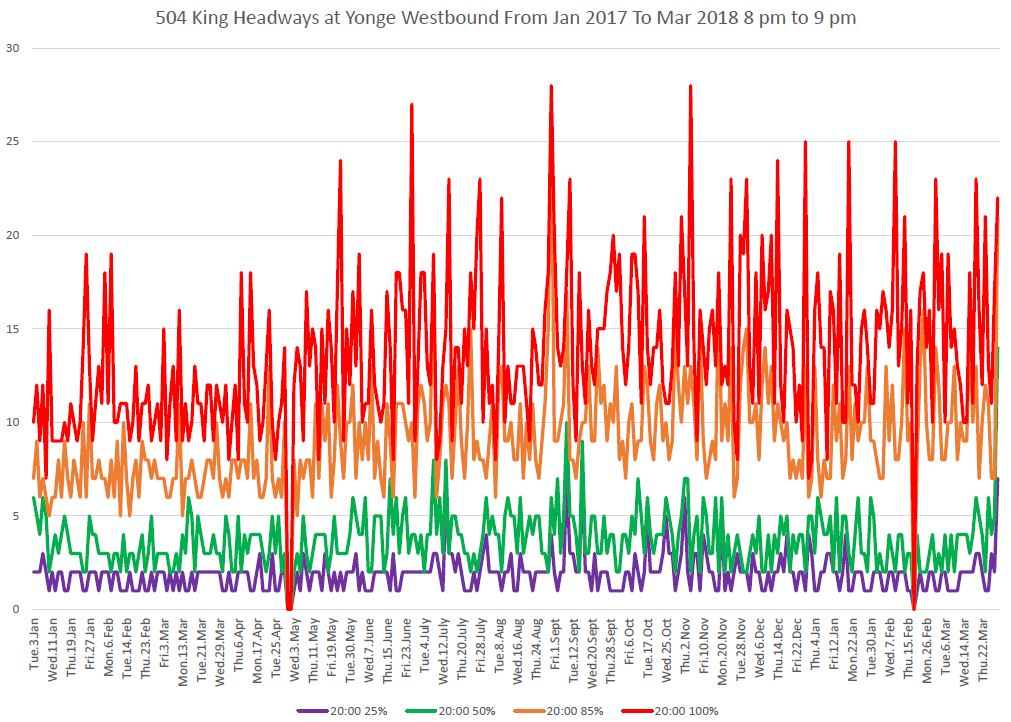 - The embargo on service south from King during 2017 shows up as a wide notch in the chart. For a time, one car might venture down to Distillery Loop just after 10 pm, and this shows up as a 100% value for the headway. Service, such as it was, by the WheelTrans shuttle bus does not show up here because these vehicles were not tracked as part of the 514 service.