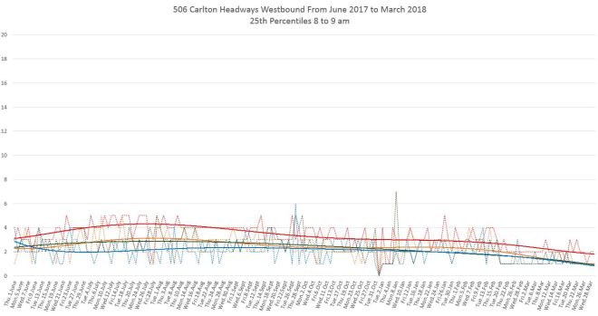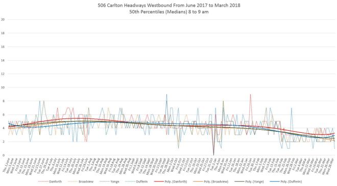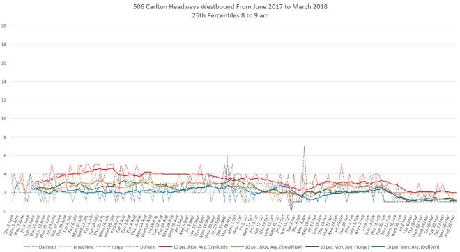 Finally, the 25th percentiles show that short headways and shorter not far west of Main Station, and by the time service reaches Broadview bunching is common. This is especially so for the bus service that has operated since mid-February. (Note that a polynomial trend line shows the change in values over a longer period and although the individual daily values drop at the February 18 schedule change, the trend line takes longer to fall to the lower level.)