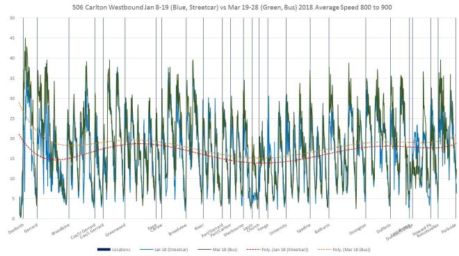 Note that this shows a fair amount of bus/streetcar overlap while the speed chart trend lines does not. There is an important difference between the two measurements.
