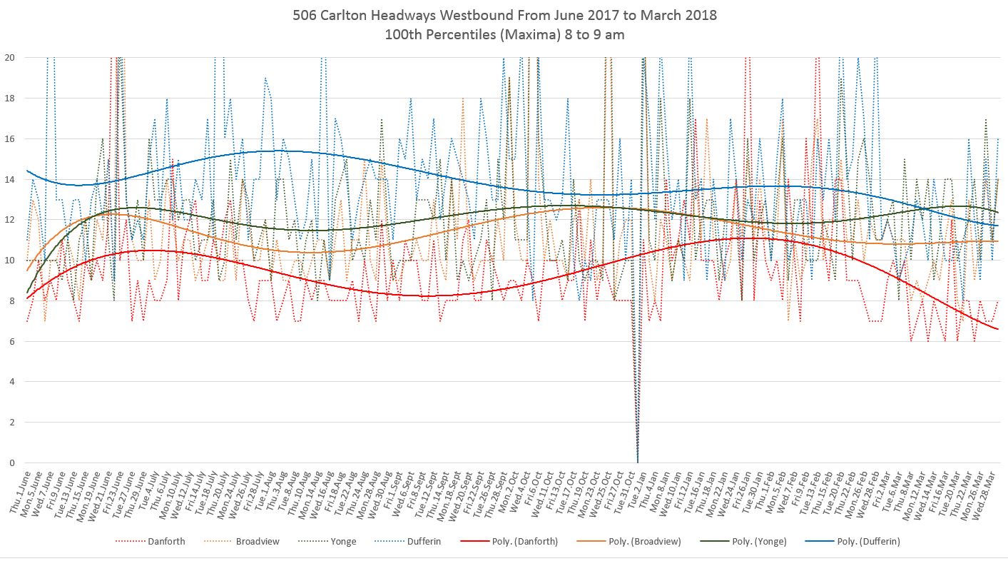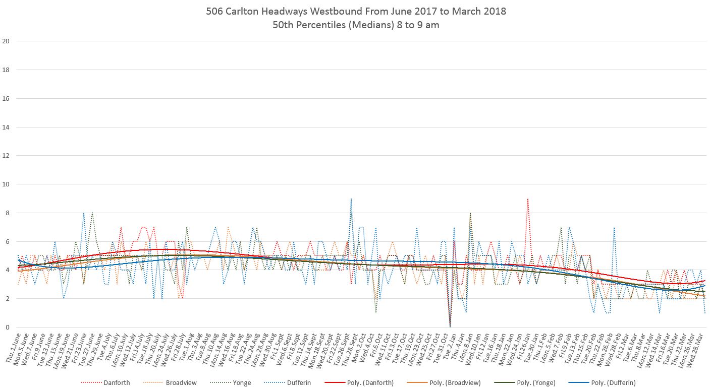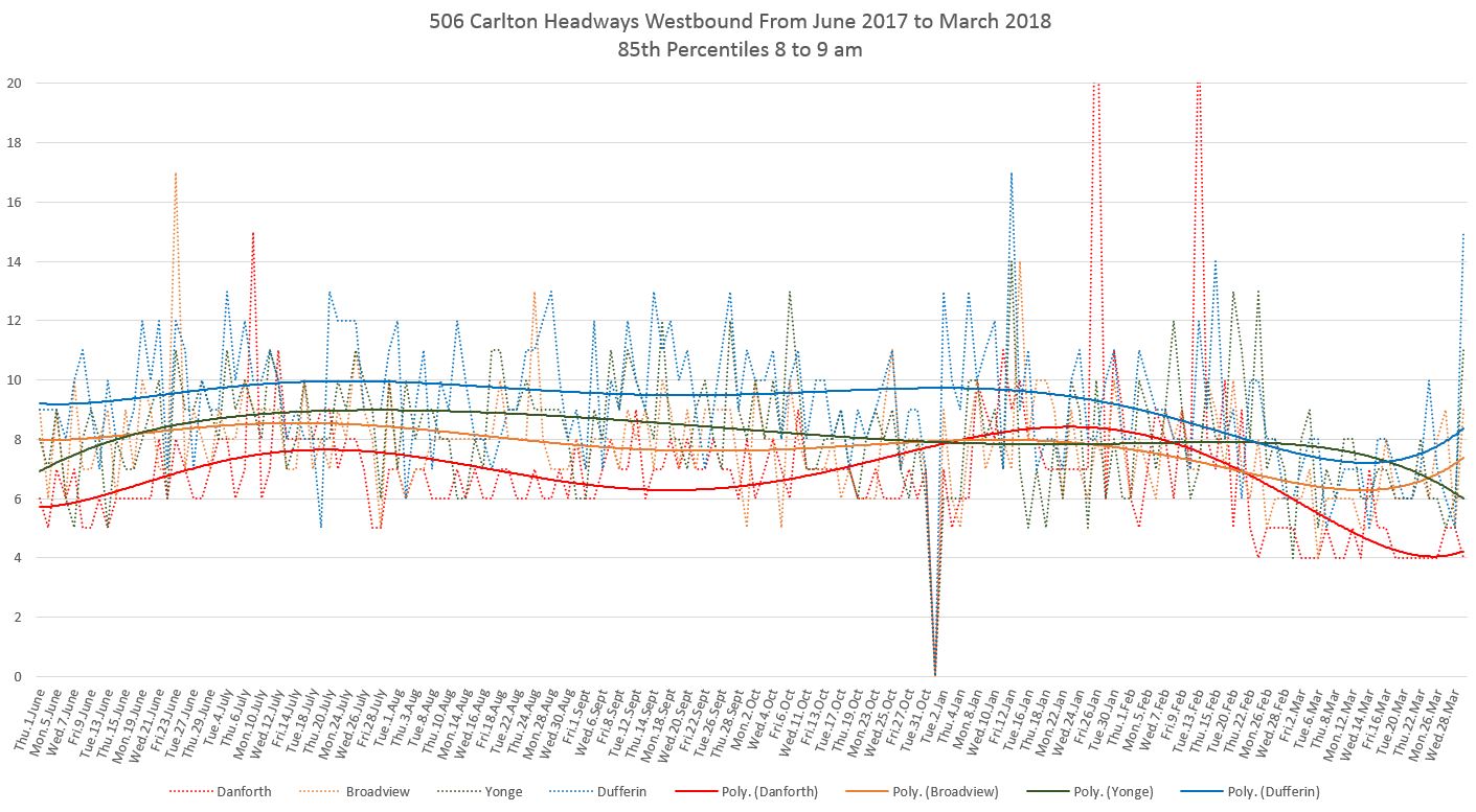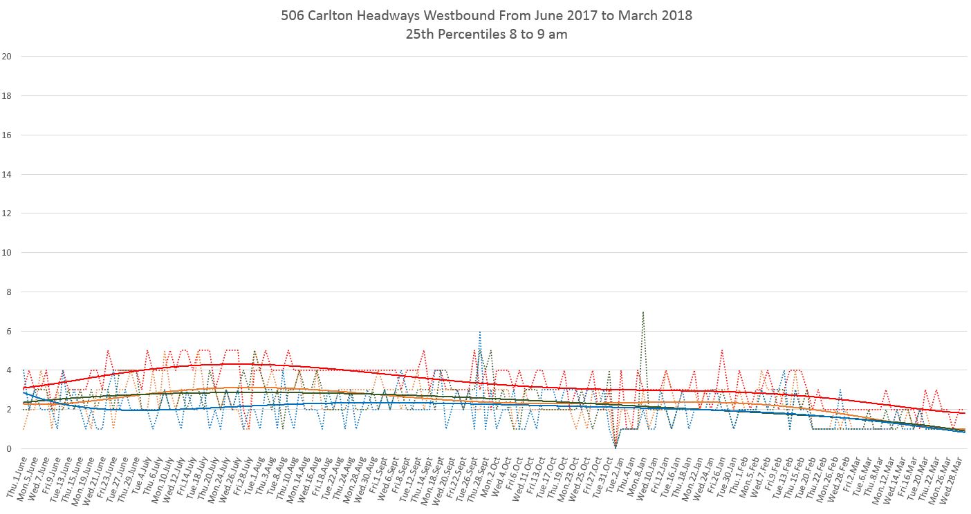 Finally, the 25th percentiles show that short headways and shorter not far west of Main Station, and by the time service reaches Broadview bunching is common. This is especially so for the bus service that has operated since mid-February. (Note that a polynomial trend line shows the change in values over a longer period and although the individual daily values drop at the February 18 schedule change, the trend line takes longer to fall to the lower level.)