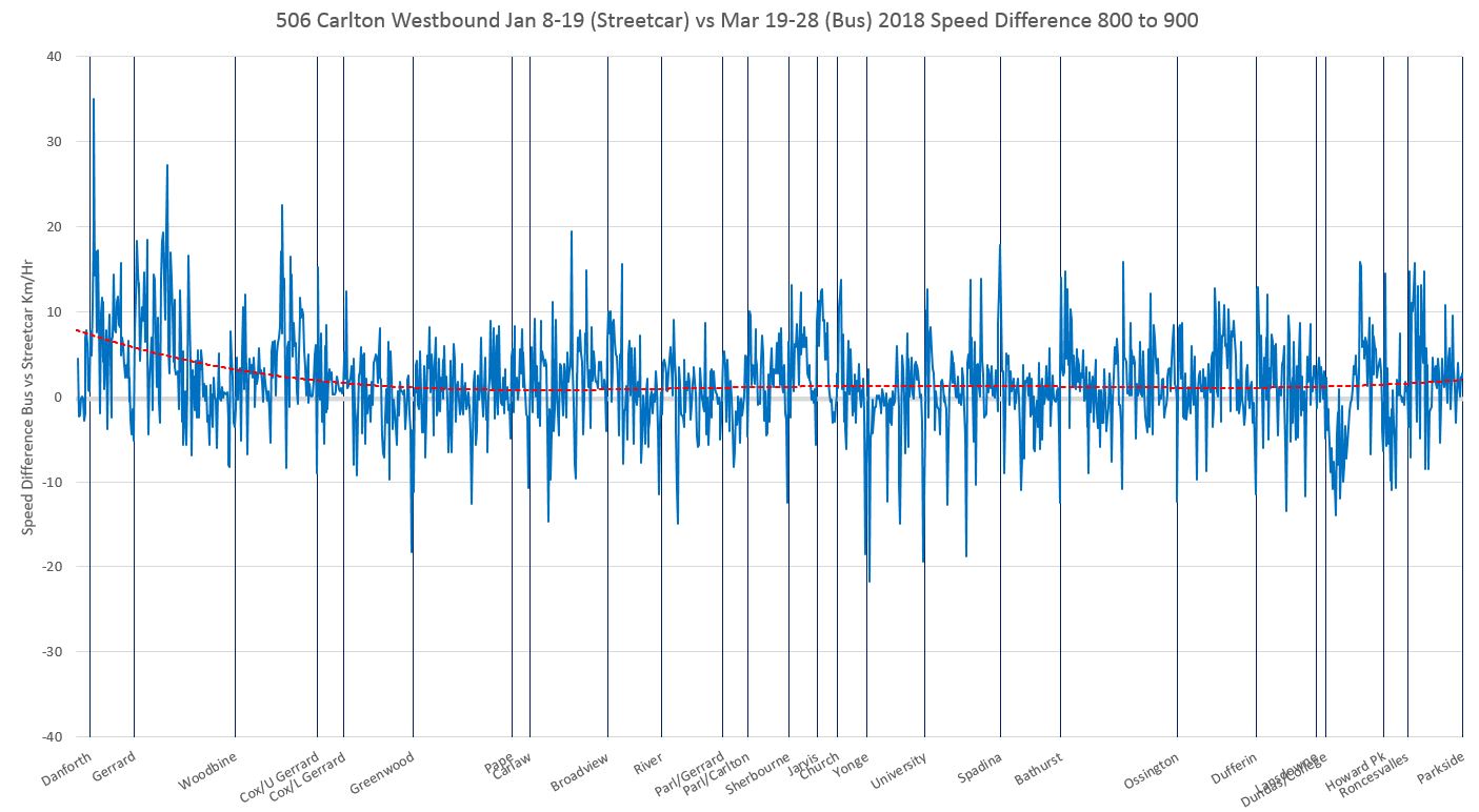 Note that this shows a fair amount of bus/streetcar overlap while the speed chart trend lines does not. There is an important difference between the two measurements.