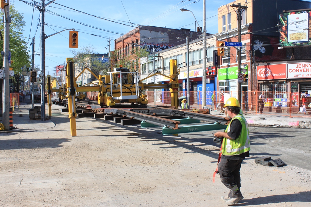 Published May 16, 2018 at 1024 × 683 in Track Replacement at Gerrard & Parliament Streets (Updated May 20, 2018) ← Previous Next → The track panel is set down in a temporary spot, but while it is on the ground, the cranes can adjust their position.