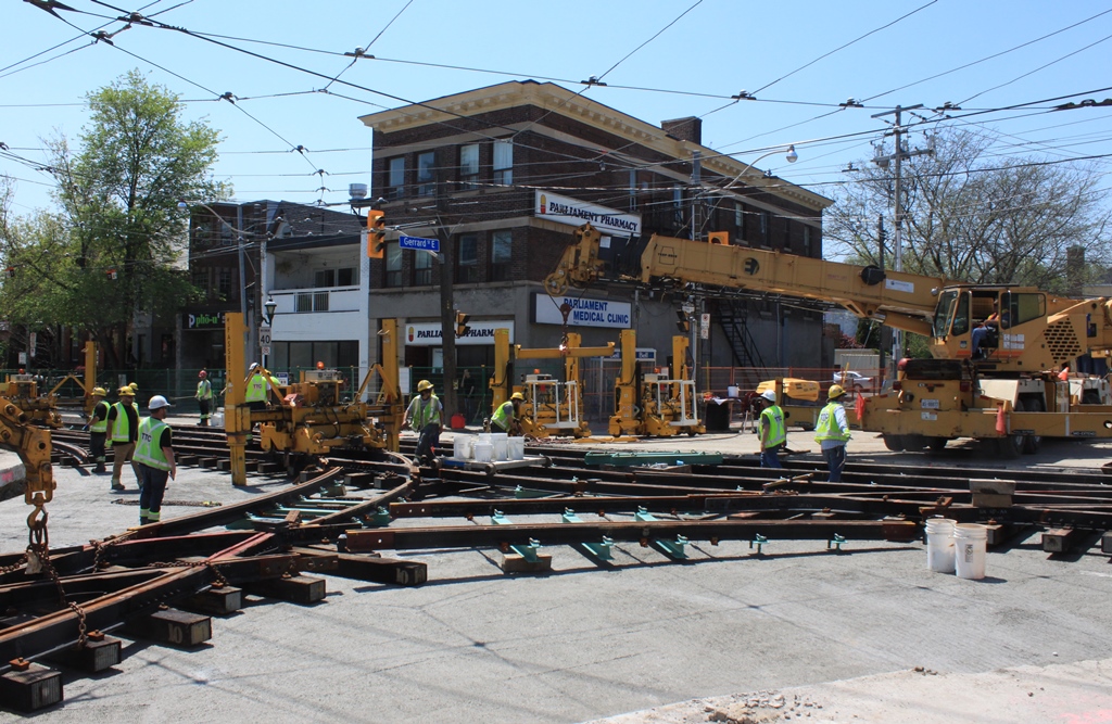 Published May 17, 2018 at 1024 × 667 in Track Replacement at Gerrard & Parliament Streets (Updated May 20, 2018) ← Previous Next → Looking SW across the intersection