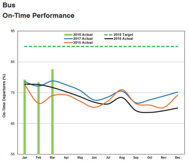 The bus system does somewhat better than the streetcars, but on time departures still sit in the 80 percent range, and trends for the past three years follow a similar pattern.