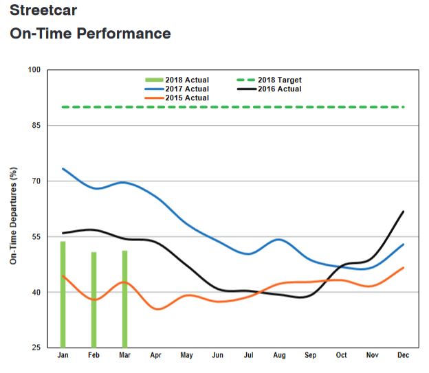 For the streetcars, barely half of the service is “on time”. The real problem for both modes is the definition of what is measured, where this is taken, and over what period.