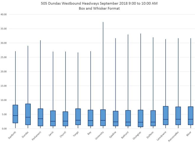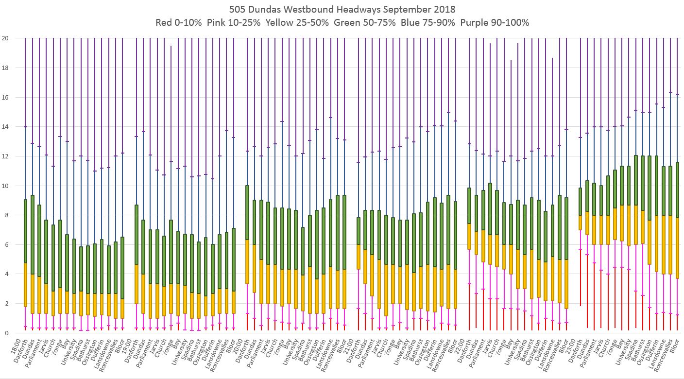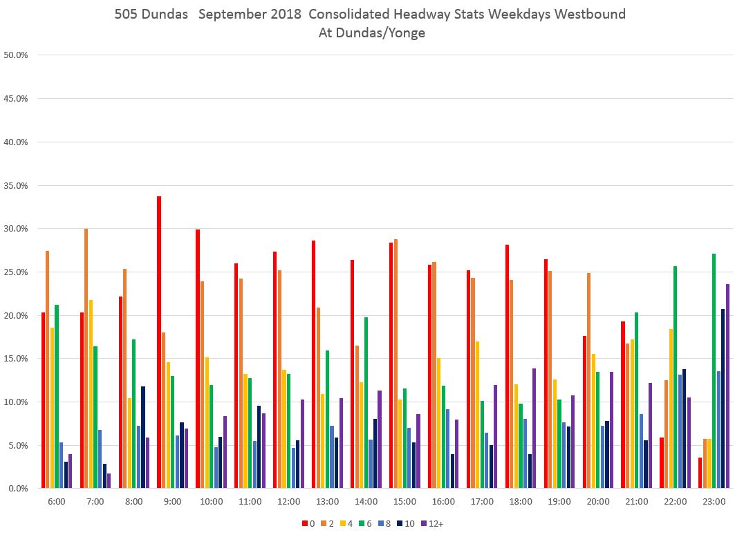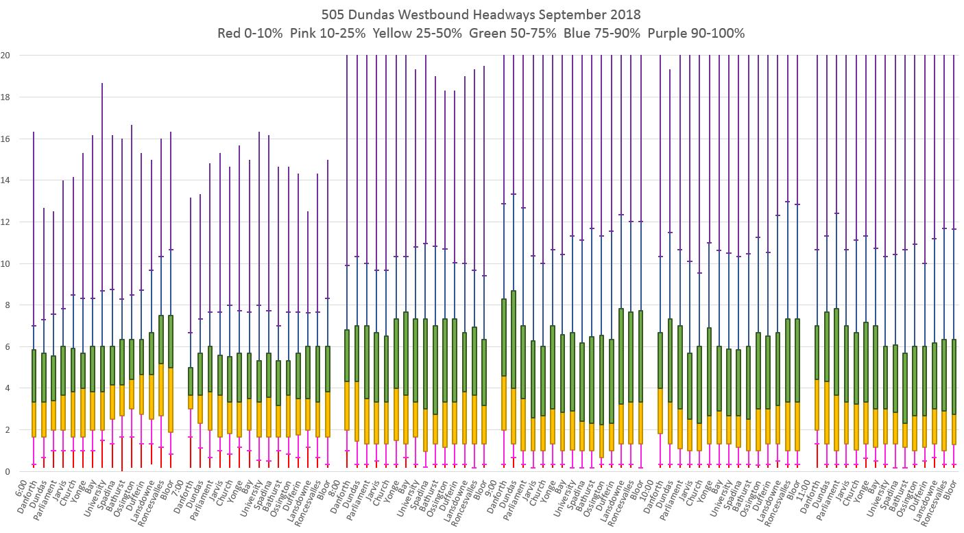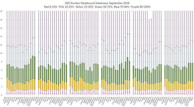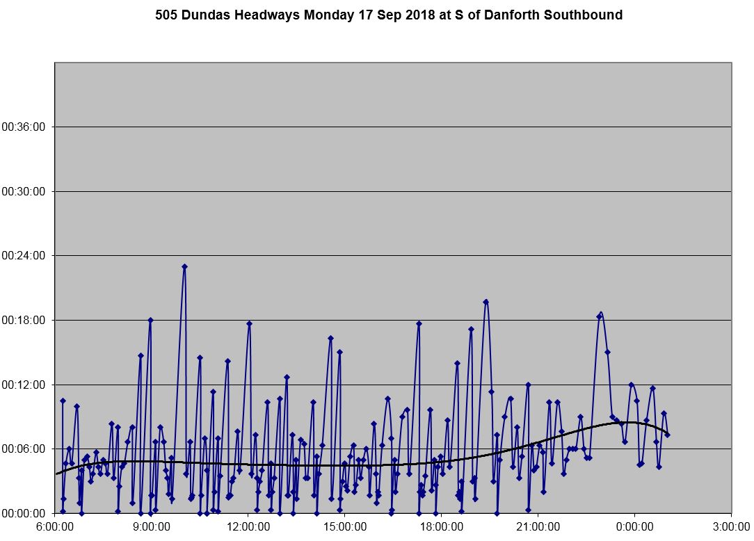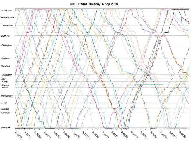 From this chart it is quite clear that there is both a wide range in headway values leaving the terminal for 505 Dundas buses on the day shown, and that many buses leave on very short headways with pairs of vehicles travelling close together. The offsetting effect of course is that there are wide gaps between these groups.