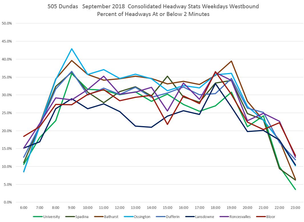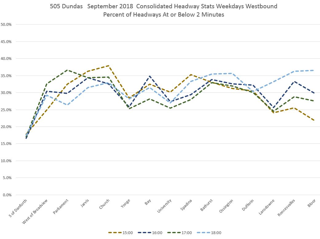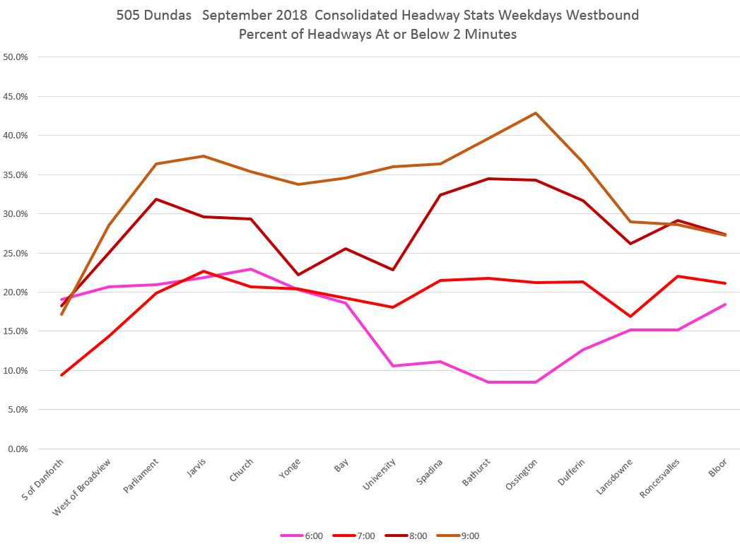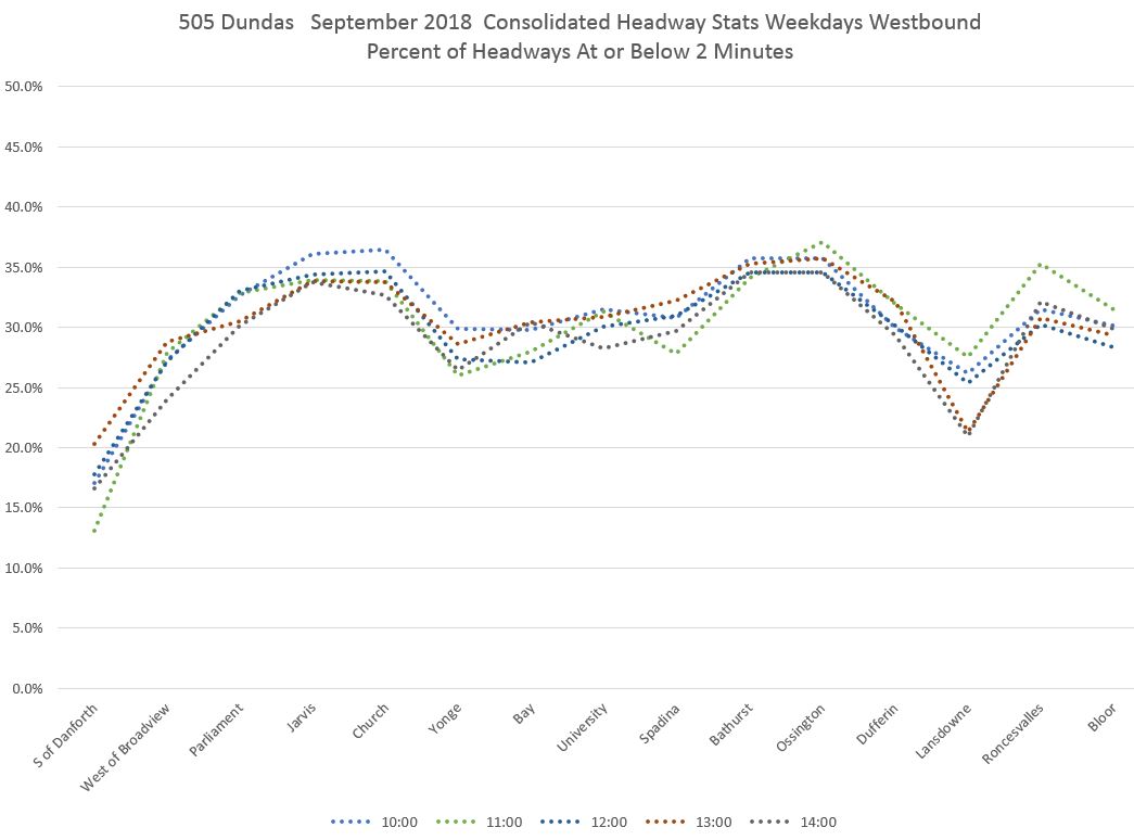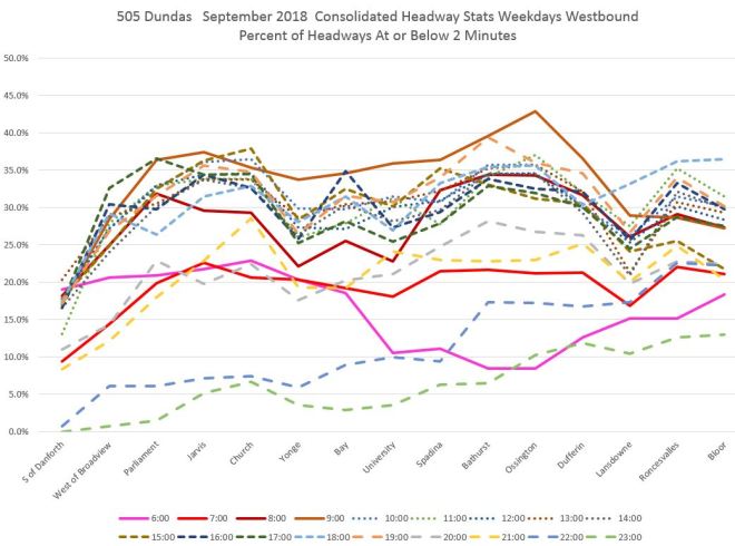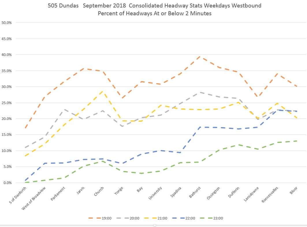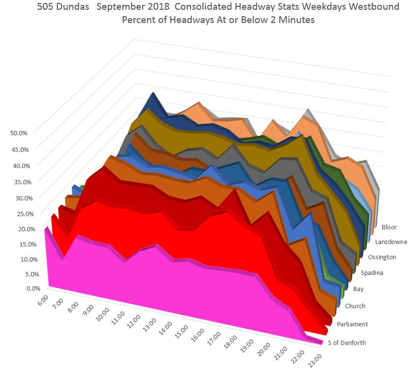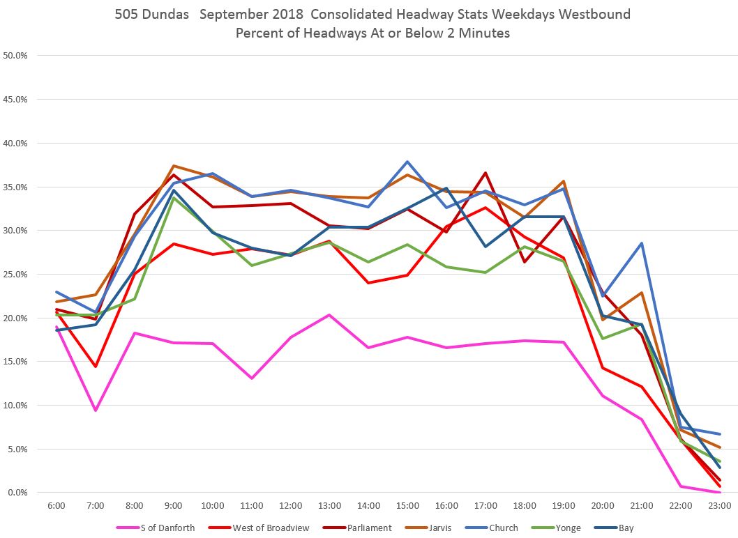 The pink line in the first chart shows that leaving Broadview Station, vehicles on short headways accounted for 15-20% of trips for much of the day. However, the proportion rises at Broadview/Dundas (red) and even moreso at Parliament (dark red), Jarvis (orange) and Church (light blue) with about one third of all trips on short headways. The values drop at Yonge (green) probably due to the combination of stop service time and the throttling effect of traffic signals, but rise again a short distance to the west at Bay (dark blue). [Danforth to Bay chart updated Oct. 9/18]