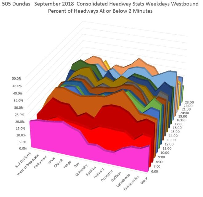 The charts which show all of the headway ranges (in two minute increments) stacked side by side for each hour at a single location have the disadvantage of showing only that location, and requiring that readers switch back and forth between busy charts to see how or if the data change from one to the other. The use of two minute ranges for the data was a tradeoff between granularity and space. Using one minute intervals doubles the width of each hour’s columns in the chart without revealing much more about where the peak value lies. Using three (or greater) minute ranges bring on the same problem with TTC’s own standards, namely that a wide grouping can mask behaviour at a level riders notice.
