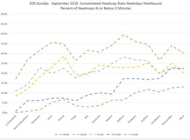 In the evening, the highest values are for the hour from 7-8 pm (19:00) and these gradually fall, especially after 10 pm when the scheduled service is less frequent and with that the opportunities for bunching. Note, however, how the same pattern of increased bunching does occur late in the evening, but simply takes longer (Bathurst westward) to really take hold.