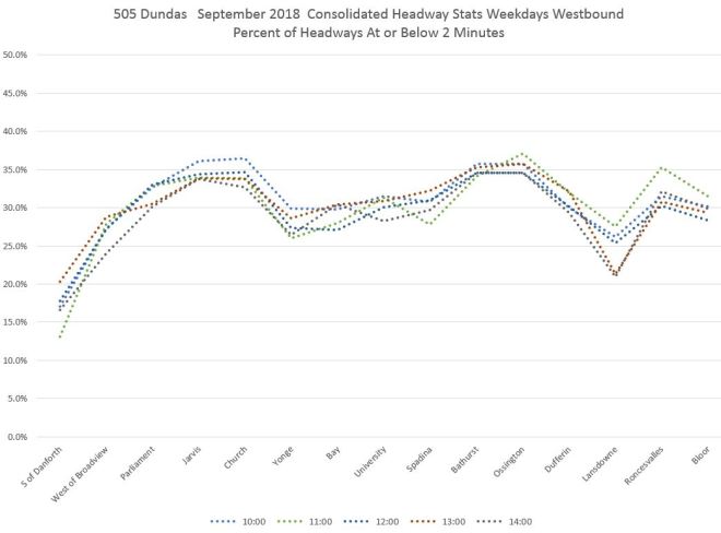 In the midday, there is almost no difference on an hour-by-hour basis including, consistently, a slight improvement westbound from Yonge (probably triggered by loading delays and traffic signal timing) that declines as service moves west to Bathurst.