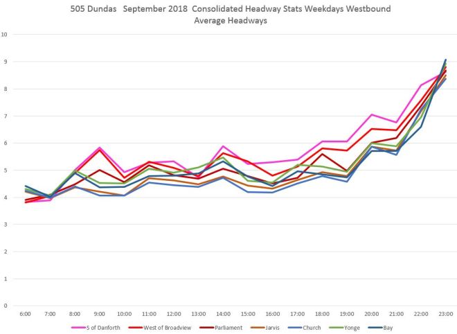 For comparison, the average headways are shown below. Note that daytime values at Lansdowne, Roncesvalles and Bloor are higher than points further east probably due to short turning of buses to compensate for the construction at Lansdowne and the diversion via Dufferin and College. [Danforth to Bay chart updated Oct. 9/18]