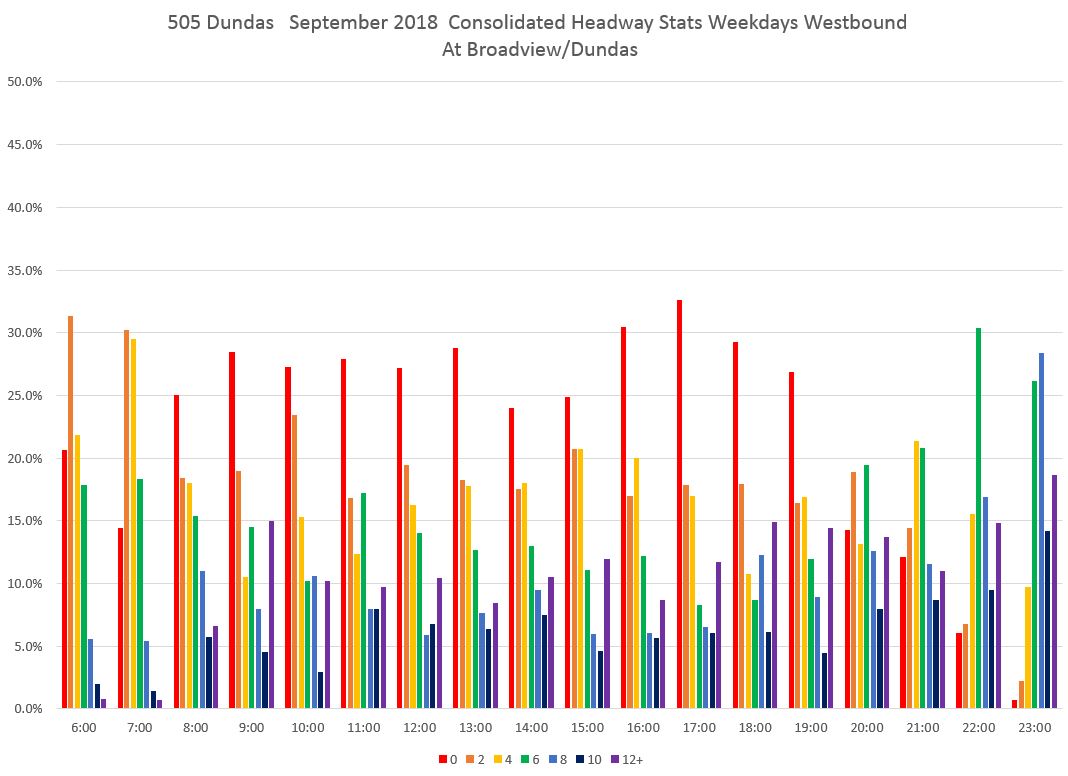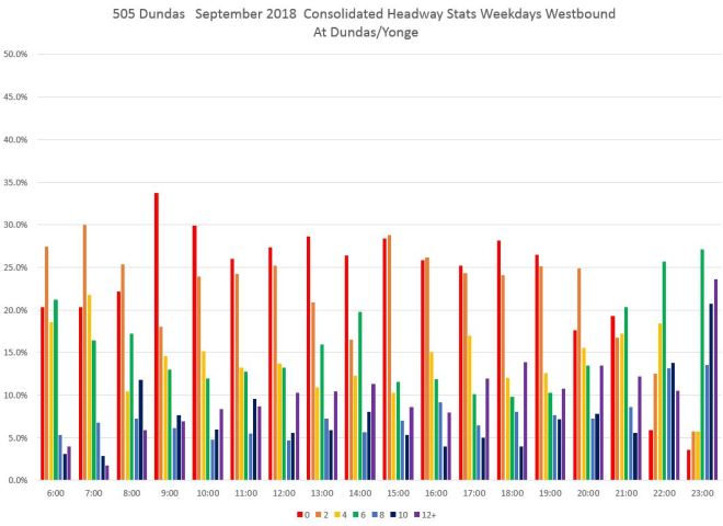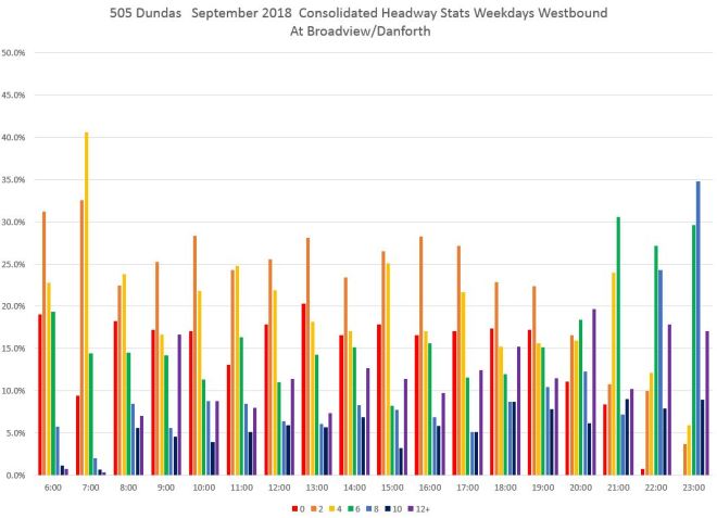 It does not take long after buses leave Broadview and Danforth for the headway distribution to shift. The chart below shows values at Dundas Street where the red bars (under two minutes) are the highest for most of the day. This indicates that a good deal of service is operating as closely-spaced pairs (or worse) of buses.