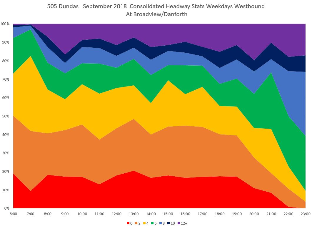 The chart below shows the bands of headway data as percentages over time. A good deal of the headway values do not lie in the 4-6 minute range of headways scheduled over the day). The darker colours are easy to understand late at night when scheduled headways are wider.