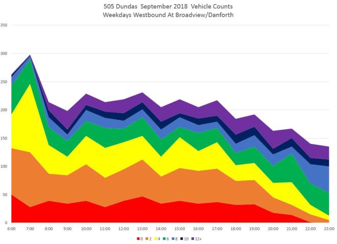 I noticed that the data for the period from 6-7 am on 505 Dundas at Broadview Station has an unusually high value for headways below two minutes. On investigation I discovered that this was caused by garage trips that were inadvertently included in regular service. This only happens for buses that arrive via Danforth rather than via Broadview because of the geometry of the screenline in my model at Broadview/Danforth. This caused these trips to be counted twice: once on the way into service, and again when they left Broadview Station. Charts in the original article that were affected by this problem have been replaced.