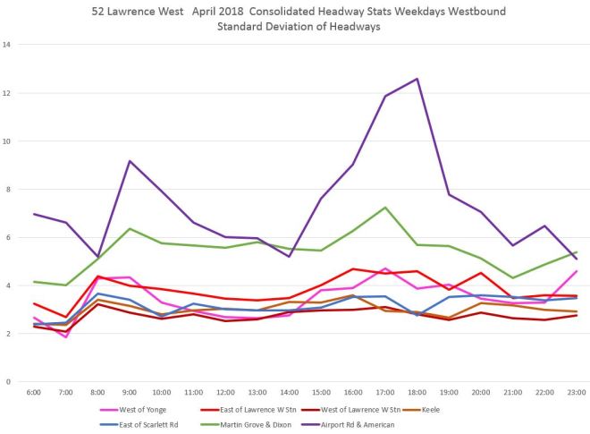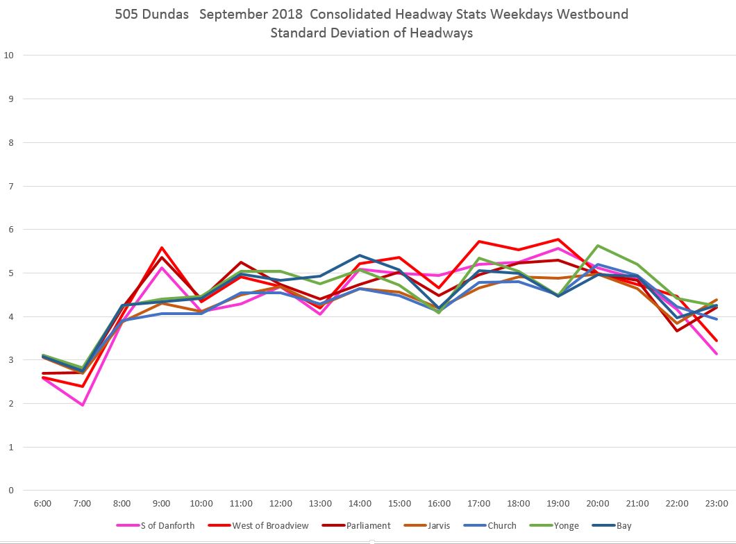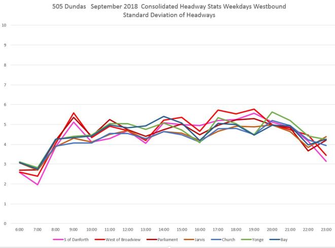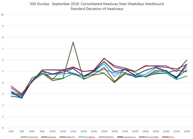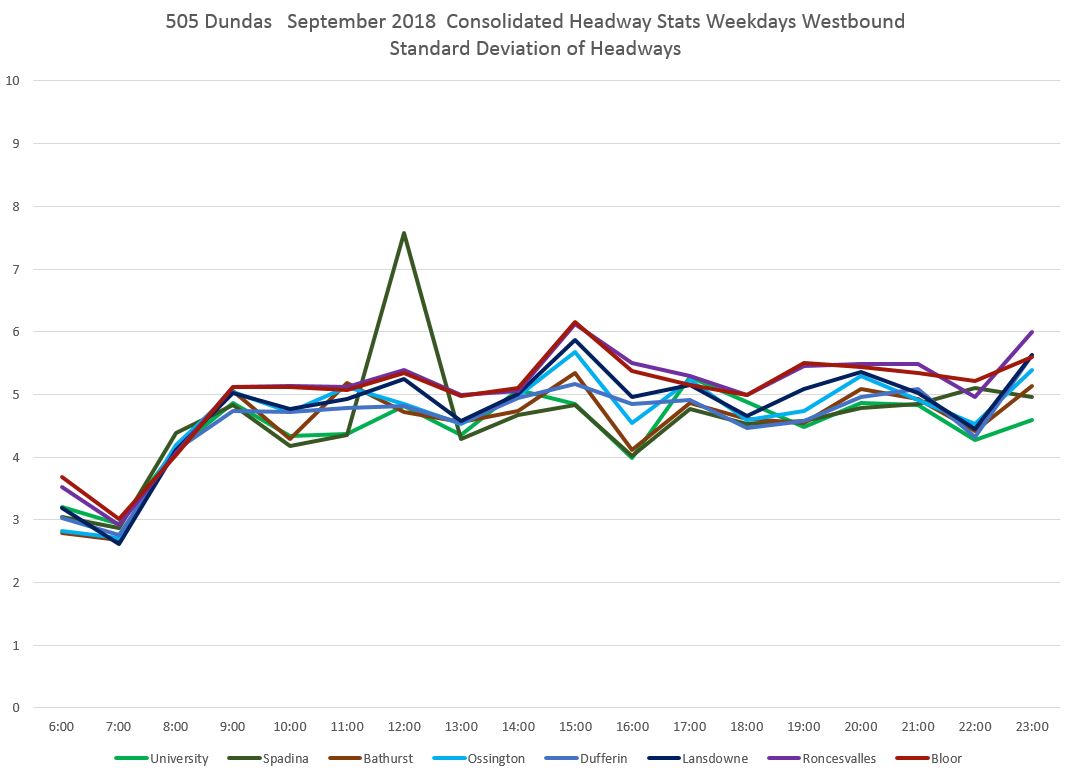 The spike in values at Spadina was caused by a single data point where a two-hour blockage and diversion meant that no vehicles crossed the screenline at Spadina for an extended period. The change in the SD value is much less than 120 minutes, but that one very large value can have an effect. Normally such data points would be filtered out, but I have left that one in to show the effect. [Danforth to Bay chart updated Oct. 9/18]