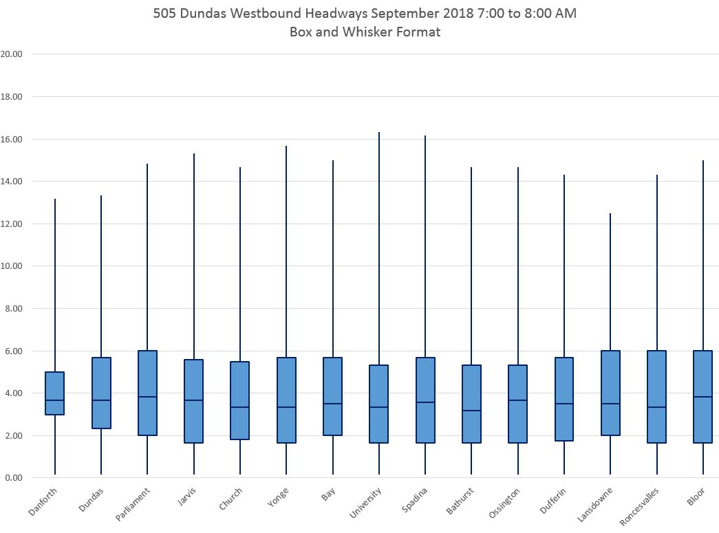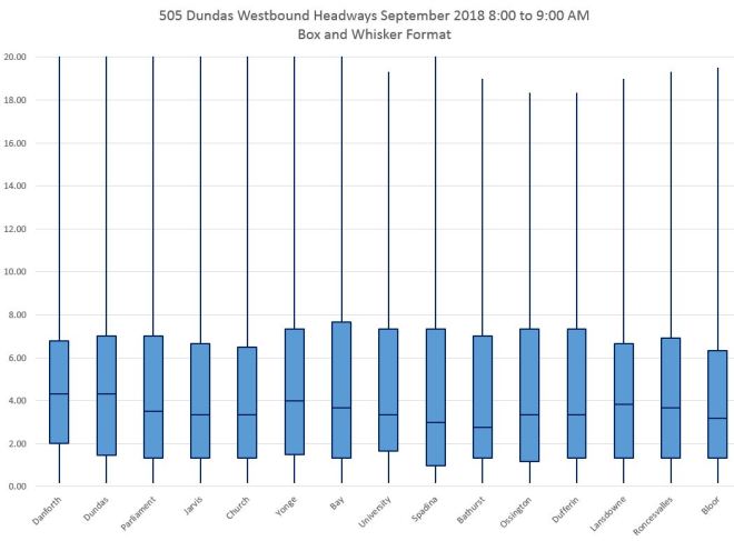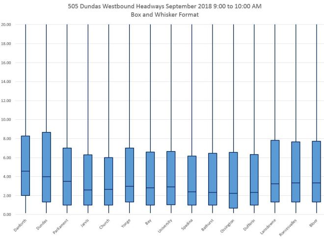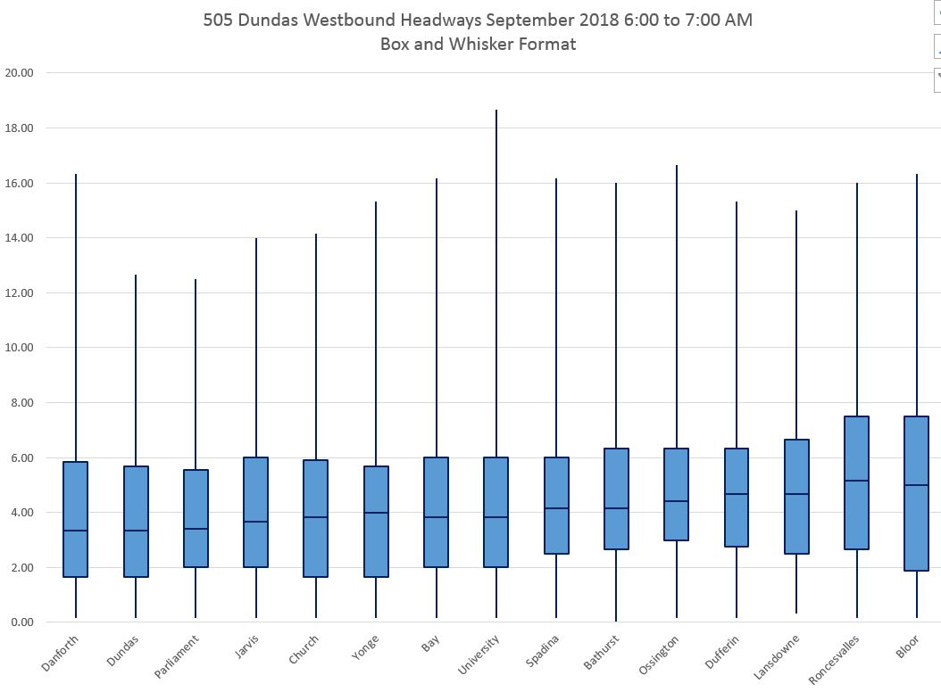 The charts below show the data for the four hours between 6 and 10 am in September, westbound on 505 Dundas, in Box and Whisker format. The y-axis maxima are set to 20 minutes so that the charts can be directly compared, but this clips instances where the maximum values lie above that level.