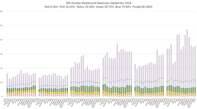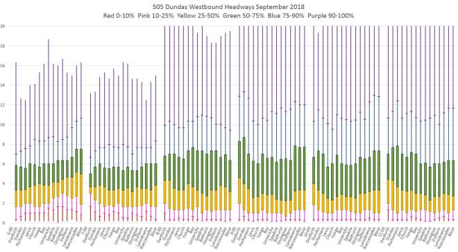 While there is a risk to over-simplify data (matching the TTC’s idea that ‘on time’ is + or – 5 minutes) but I wonder if it would be clearer to use your full data and select a few stops on a route and chart how long a customer arriving at them would wait for the next vehicle and do this at 6 – 8 standard times each day, every day. The number of stops ‘charted’ would depend on the length of the route but would, I think, include either the departure point or the first stop after it, the last stop before or at the terminus point and, on a route like King, maybe 5 or 6 in between. I would then look at maybe 6-8 specific hours. One before am rush, one during it, one in mid-morning, one in mid-afternoon, one at pm rush and one in mid-evening and one late at night. Doing this would allow a ‘casual reader’ to look at ‘their route’ and see that if they were at King & Jarvis at 8pm (for example) the normal wait time on a weekday would be x minutes. This would, I think, flag problem areas/times/routes and then the full data-set could be analysed in greater detail.