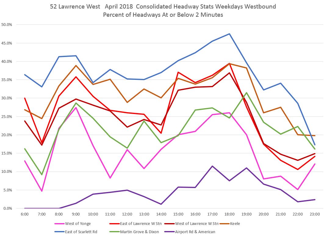 Average headways show the service design along the route with the shortest scheduled headways between Lawrence West Station and Scarlett Road, another band for locations east of Lawrence West, still higher at Martin Grove, and higher still at the airport.