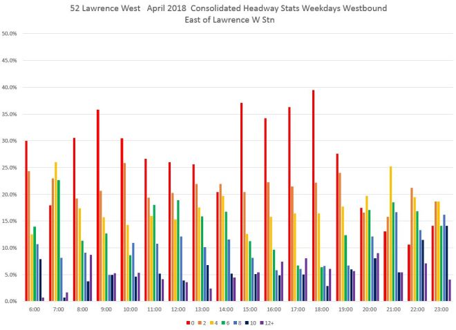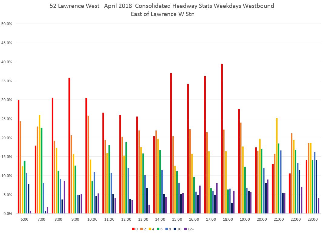 By comparison, here are similar charts for the 52 Lawrence bus. This route is different from 505 Dundas in that all service does not operate over the entire route. As of April 2018, some buses only came as far east as Lawrence West Station, and at the western end service is split between the Airport and Westway branches.