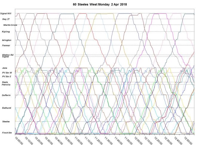 Through the midday, note the bunching of service east of Pioneer Village Station and the uneven service west to Signal Hill. The length of layovers at the west end of the line show that scheduled travel time was not an issue and the unevenness of departures was a matter of driver choice and a TTC standard that allows a six-minute wide margin for “on time” service.