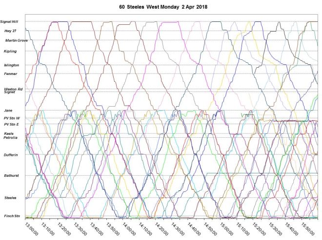 In the first section of this article, I reviewed the headways on 60 Steeles West which, to be charitable, are not particularly reliable, especially west of Pioneer Village Station.