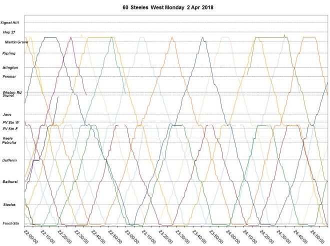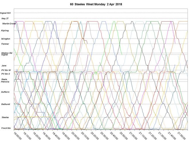 Service through the evening has few congestion effects, but headways continues to be uneven. In particular note that the blending between through service to Martin Grove and the shorter Pioneer Village branch is poor leaving both Finch and Pioneer Village Stations, both points where service could be regulated for even spacing.