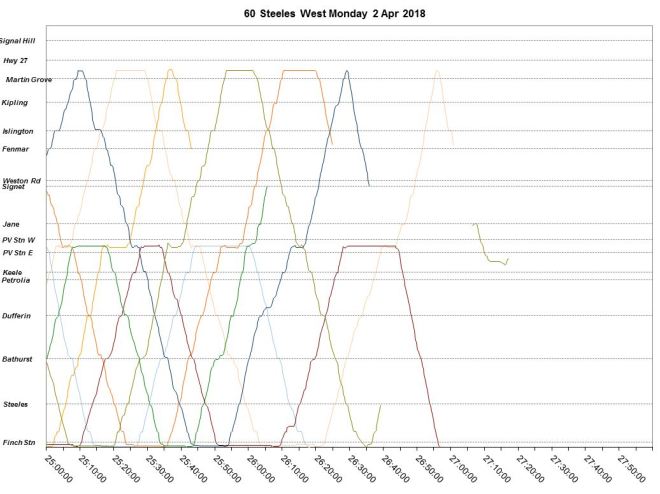 Steve: The routes I have “in the hopper” are the long east-west routes as well as few north-south ones that would be affected by the Spadina Subway Extension. There is a further problem currently with the migration to the VISION tracking system from which I cannot yet obtain data at the level of detail needed for these analyses.