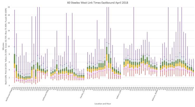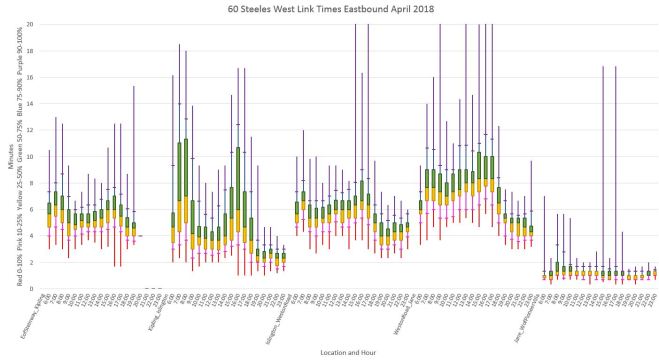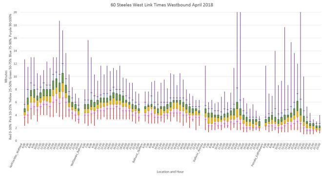 Of particular note here and in later charts is that the primary location of delays between Finch Station and Steeles Avenue is northbound approaching Steeles.