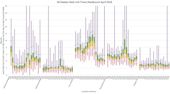 The western half of the route suffers from erratic headways as seen in the previous article, and it also has locations of considerable congestion. The average travel times on this segment are shown below.