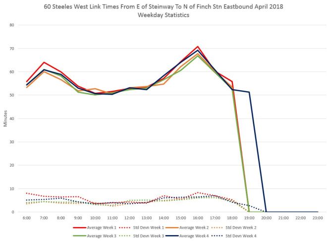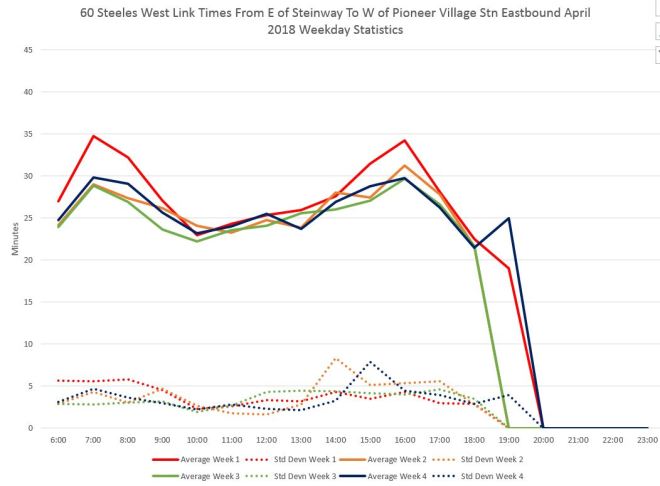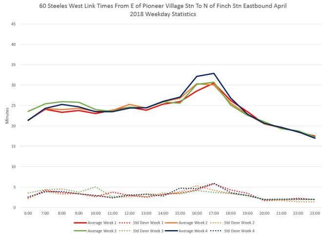 Here are charts showing the average travel times between Finch and Pioneer Village Stations measured from just north of Finch to just east of Pioneer Village. (This omits time actually spent in the stations which can vary considerably.) During the PM peak, the standard deviation can be over five minutes indicating a fairly wide range of travel times.